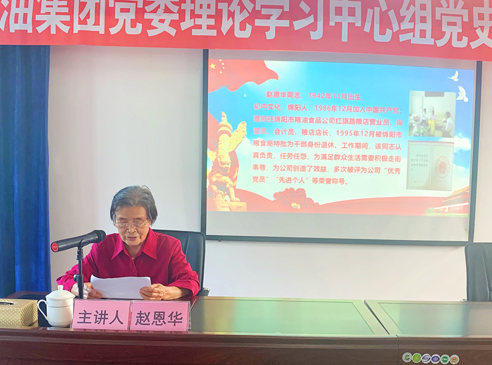 原绵阳市高新区良友贸易公司(现市高新粮油购销有限公司)党支部书记、曾荣获原国家粮食部授予的“全国粮食劳动模范”称号的蒋天兴老同志, 1976年加入中国共产党,现已八十高龄,他自1966年参加粮食工作以来,曾先后担任过驻乡农管员、付款员、司称员、会计员以及粮站站长等多个职务。蒋天兴同志爱岗敬业,拼搏实干,在每个岗位上都积极争创一流,练就了一身过硬的本领;他淡泊名利,甘于奉献,为粮油事业发展竭尽心力,为企业和社会作出了突出贡献。党课中,他认真回顾了改革开放以来粮食企业的发展历程,质朴分享了自己几十年来慎终如始做好储粮保粮工作,吃苦耐劳,无私奉献的先进事迹。他殷切寄语在座人员,要树立正确的“三观”,正确看待苦乐、得失、成败,全心全意为人民服务;要不忘初心、牢记使命,强化对党赤诚的心、对工作敬业的心、对同事团结的心,切实为企业、为群众办实事。